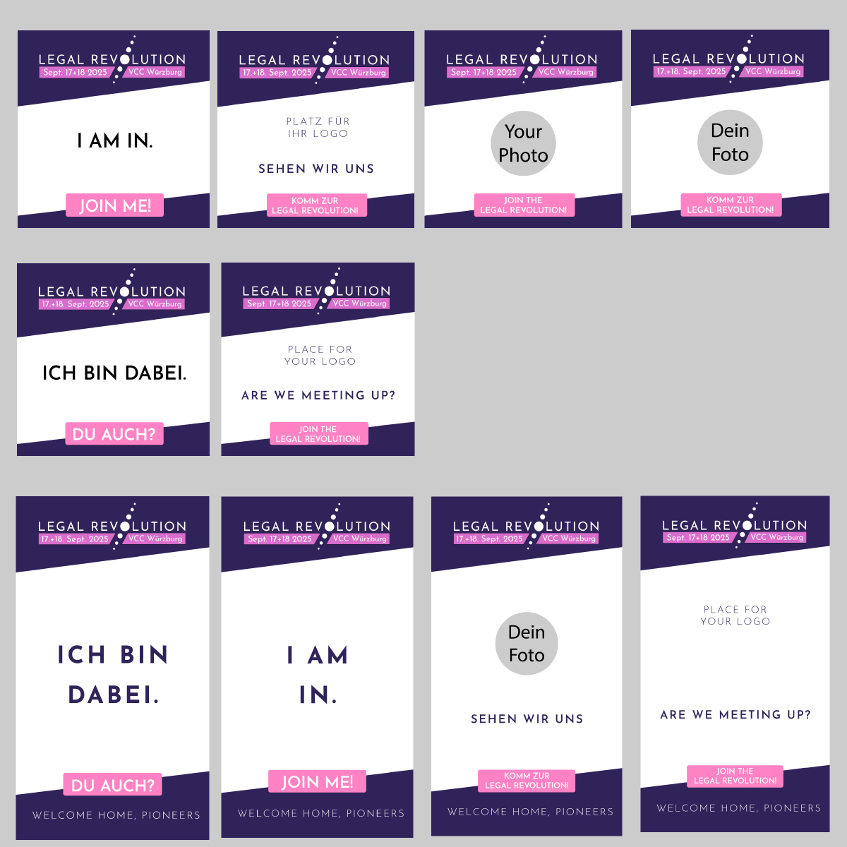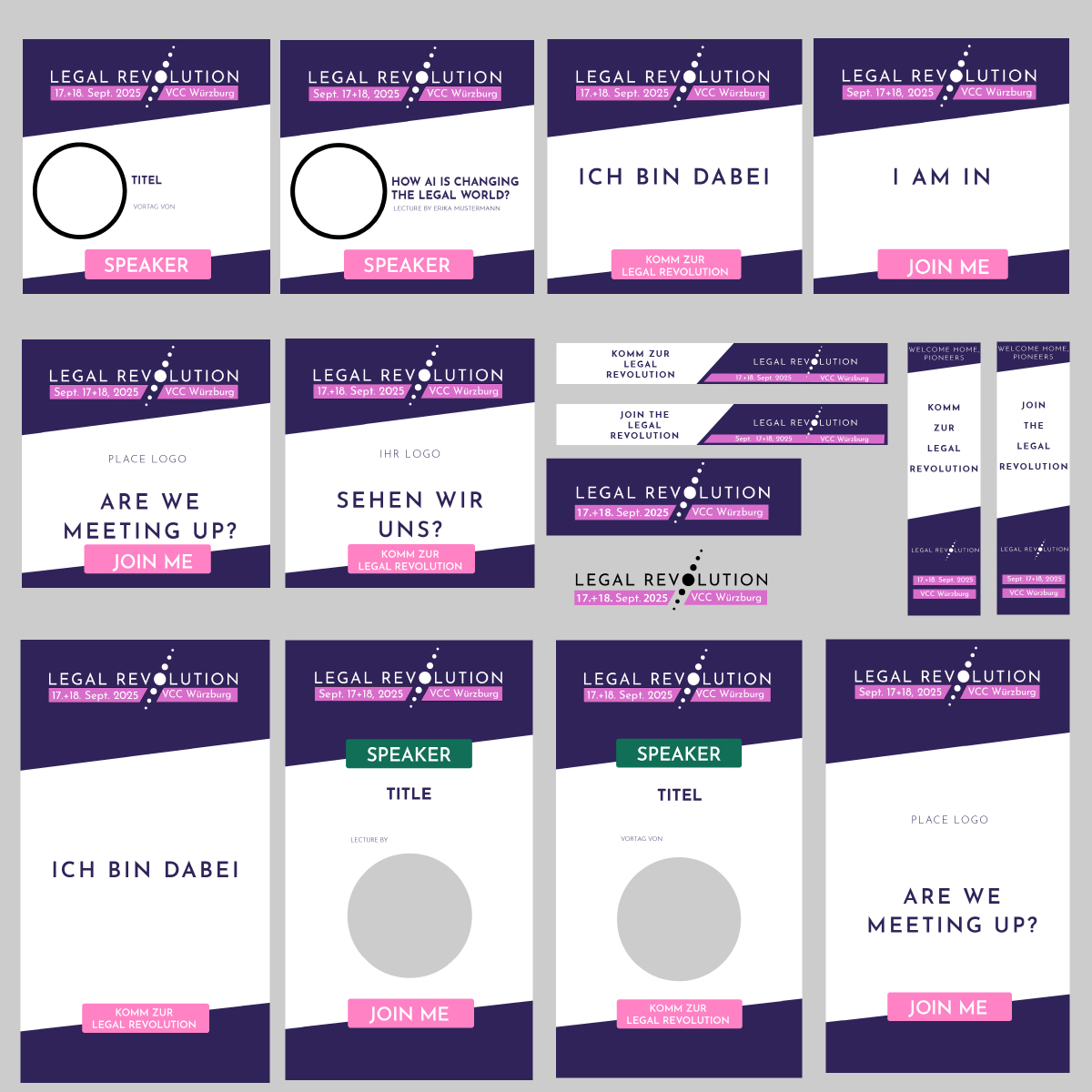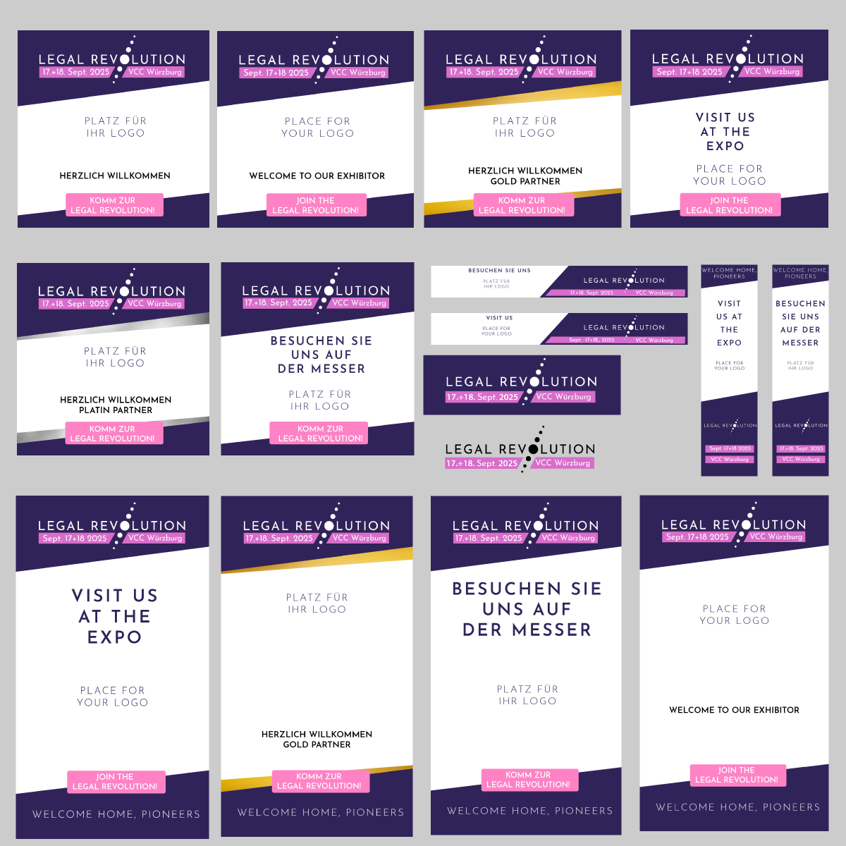 Die Kommunikations- und Marketingkits enthalten Banner, Badges und Logos auf Deutsch und Englisch, die Sie für ihre Social Media Posts, ihre Website, E-Mails, Drucksachen und mehr verwenden können, um Ihre Messepräsenz, Ihren Vortrag oder Ihre Teilnahme an der LEGAL REVOLUTION 2025 zu kommunizieren.